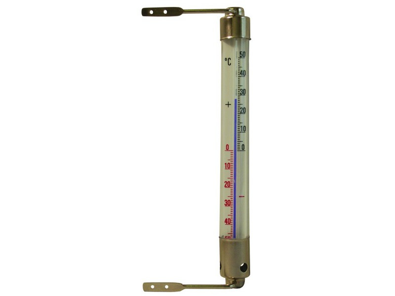 Ablakra rögzíthetõ kültéri hõmérõ, alumínium végekkel, fixen rögzíthetõ jobb, vagy bal irányba (2db szeggel, nem tartozék). Hõmérsékleti tartomány: -50°+50°C/1° osztással, környezetbarát, borszesz töltéssel Méret:200x20mm