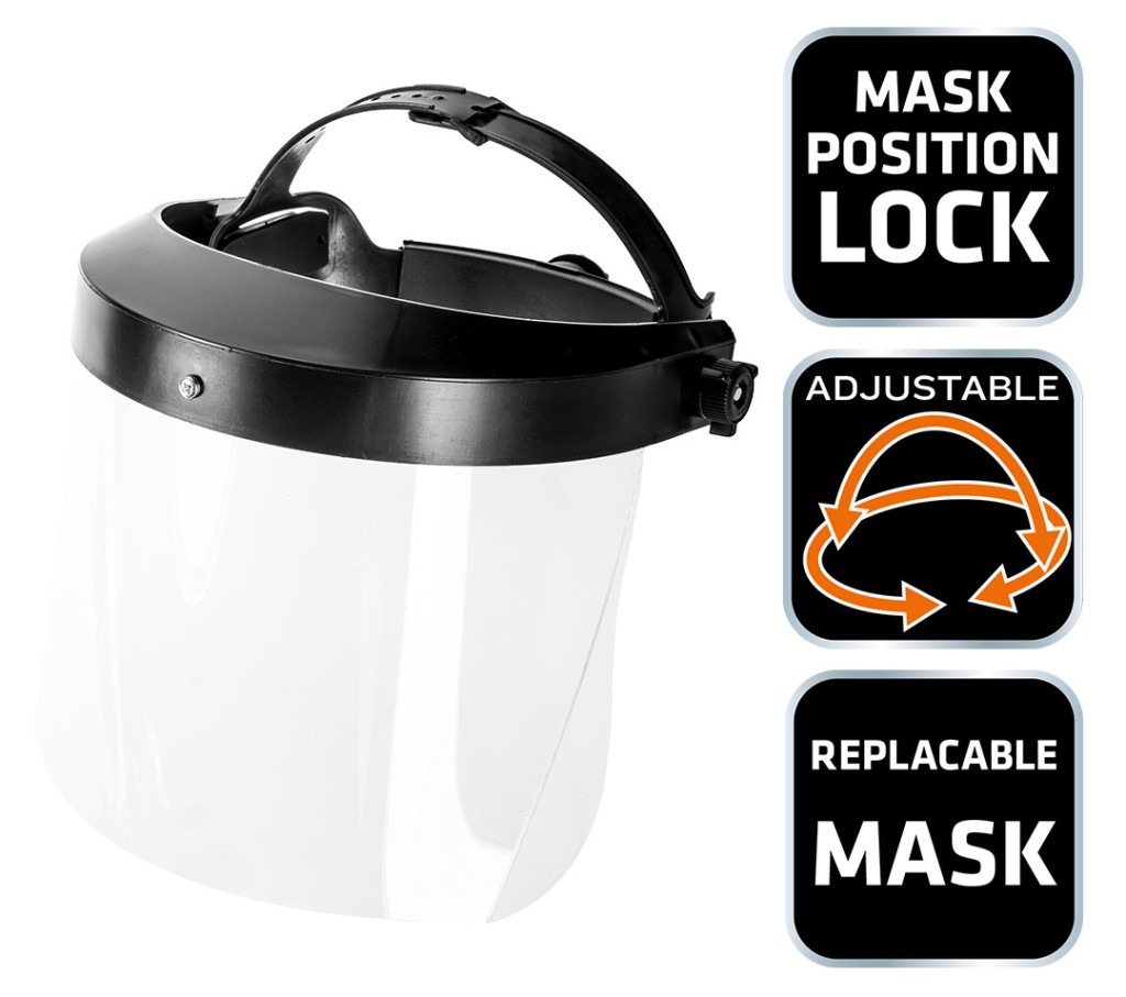 Arcvédő, cserélhető pajzs, 97-391, NEO A maszk védi az arcot a felfröccsenő szilárd részecskék és folyadékcseppek ellen. Megfelel az EN 166 szabvány követelményeinek. Tökéletes megoldás kézi és gépi munkához, fa vagy műanyag megmunkálásához, sőt fűnyíráshoz is. Az arcvédőn a fejbőség, a fejre illesztés mélysége valamint a maszk és az arc közötti vízszintes távolság fokozatmentesen állítható. A pajzs vastagsága 1 mm, ami lehetővé teszi a szabad légzést.