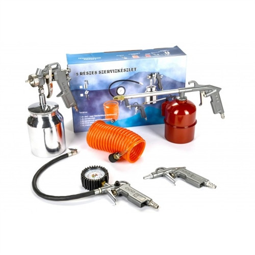 Szervizkészlet ház körüli és barkács felhasználásra. Tartalma: 1 db alsótartályos festékszóró piszoly (1 literes tartállyal), 1 db pneumatikus tömlőfúvató, 1 db spiráltömlő gyorscsatlakozóval (munkahossz 5 méter, átmérő 8x6 mm), 1 db rövid csövű lefúvató pisztoly, 1 db olajszóró pisztoly. A készletet kartondobozban szállítjuk.