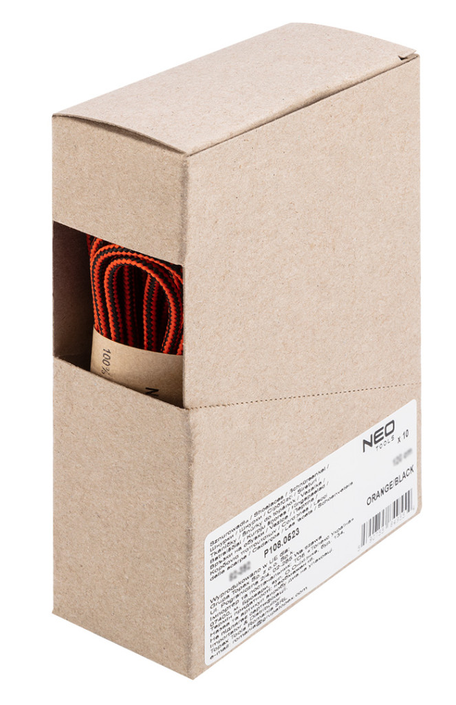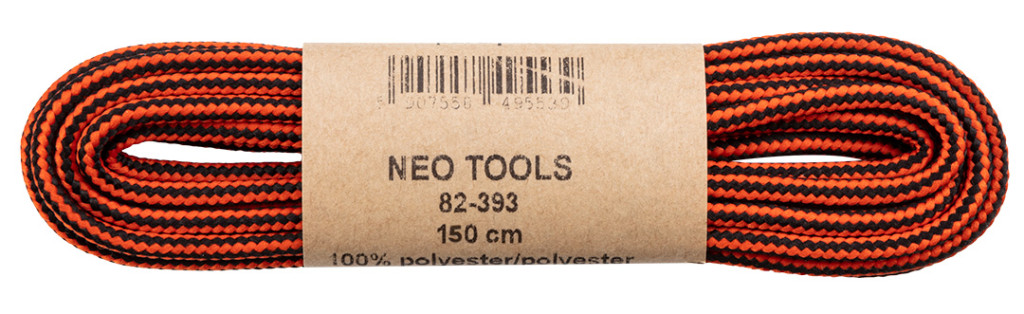 A NEO narancs/fekete munkacipőfűzője 100% poliészterből készült. Kerek keresztmetszetű, 150 cm hosszúságú és 4 mm átmérőjű.. Erős, sűrű szövéssel rendekeznek, ami biztosítja, hogy a cipőfűzők nehezebben oldódjanak ki. Munkabakancsokhoz és túracipőkhöz egyaránt javasolt a használata.. Minden évszakban használható.