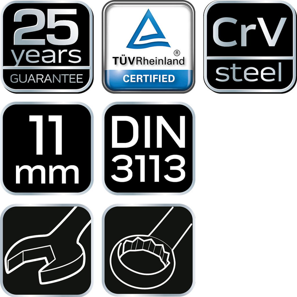 A NEO csillag-villáskulcs a DIN 3113 szabványnak megfelelő kivitelű. A kiváló minőségű króm-vanádium acél sokéves tartósságot biztosít a kulcsnak. A szerszám minőségét bizonyítja a TÜV tanúsítvány és a gyártó által nyújtott 25 éves jótállás. A NEO márka a professzionális igényeket is kielégíti.
