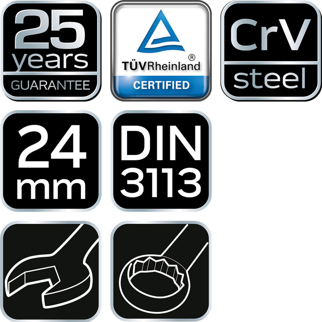 A NEO csillag-villáskulcs a DIN 3113 szabványnak megfelelő kivitelű. A kiváló minőségű króm-vanádium acél sokéves tartósságot biztosít a kulcsnak. A szerszám minőségét bizonyítja a TÜV tanúsítvány és a gyártó által nyújtott 25 éves jótállás. A NEO márka a professzionális igényeket is kielégíti.