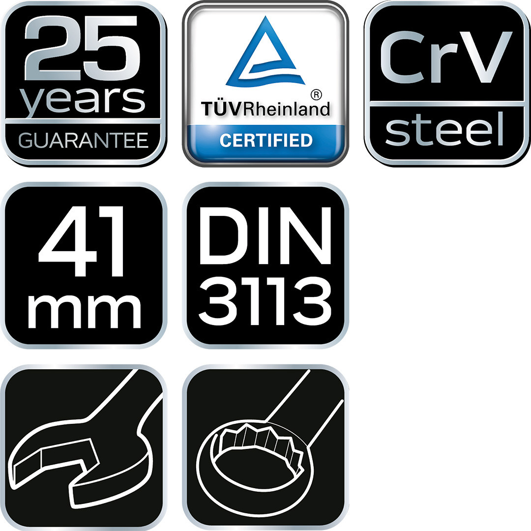 A NEO csillag-villáskulcs a DIN 3113 szabványnak megfelelő kivitelű. A kiváló minőségű króm-vanádium acél sokéves tartósságot biztosít a kulcsnak. A szerszám minőségét bizonyítja a TÜV tanúsítvány és a gyártó által nyújtott 25 éves jótállás. A NEO márka a professzionális igényeket is kielégíti.