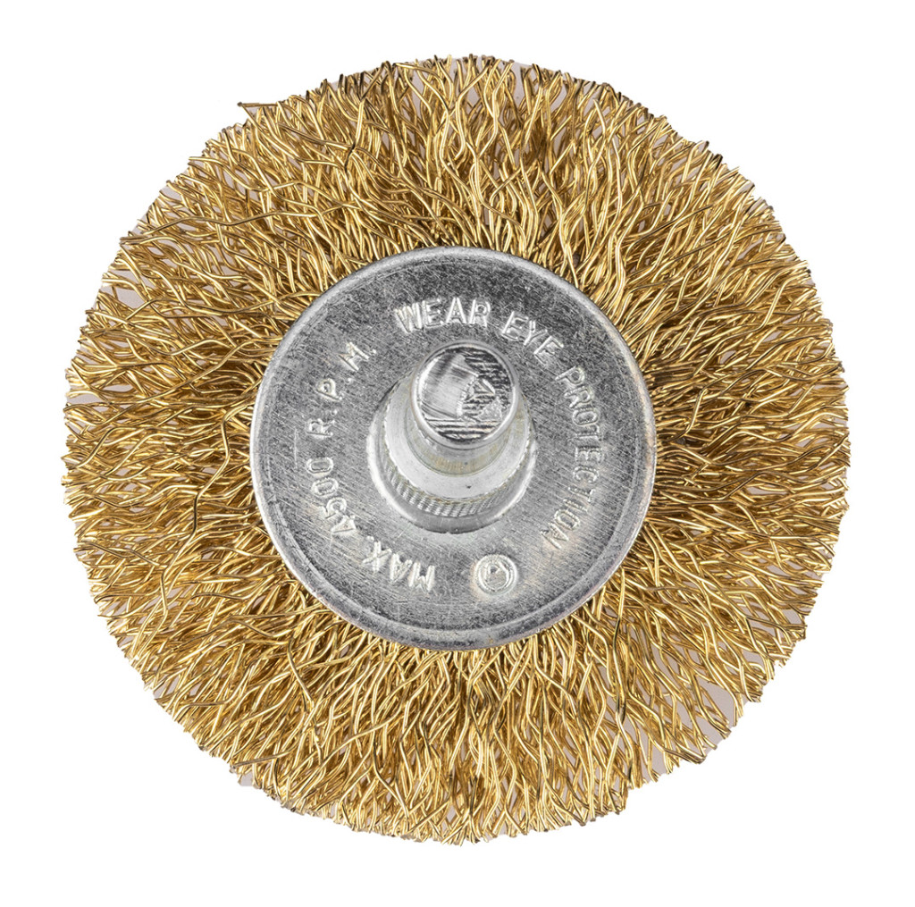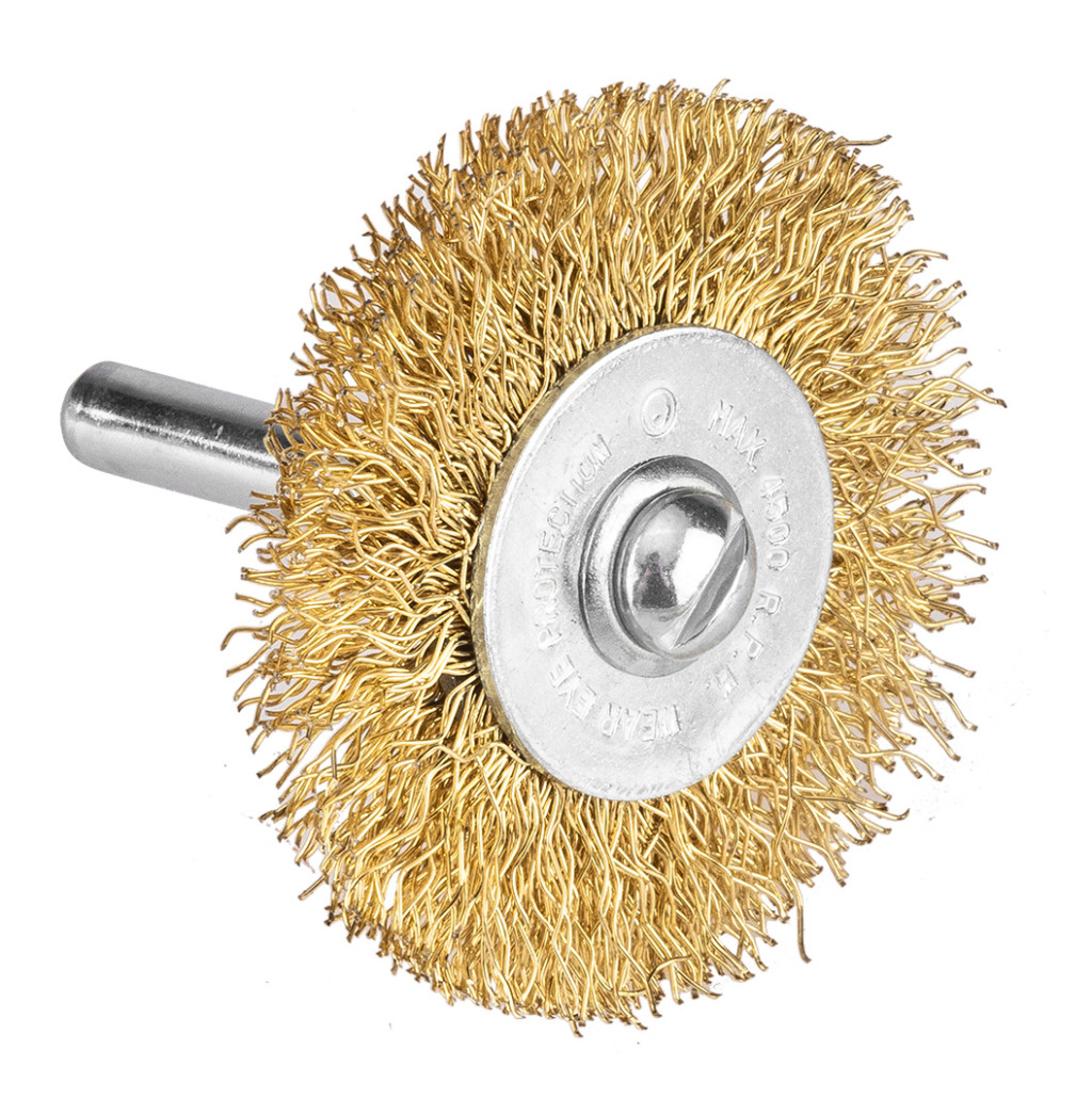 Drótkerékkefe, krimpelt drót, sárgaréz bevonatú, 25, 38, 50, 63, 75 mm, 5 db, 3 db, 6 mm-es szárral, 57T403 GRAPHITE, krimpelt sárgaréz bevonatú drótból. Maximális fordulatszámuk 4500 rpm. A termékek megfelelnek az EN 1083-2 szabványnak, és a készlet 5 db átmérőjű tárcsás drótkefét tartalmaz: 25, 38, 50, 63 és 75 mm-es, valamint 3 db 6 mm-es nyéllel. A tartó fúrógéppel és csavarozógéppel való használatra alkalmas. A GRAPHITE drótkorongkefék sokoldalúan felhasználható termék számos feladathoz.