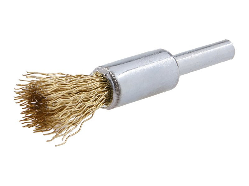 Rotary brush - wavy, FESTA brushes guarantee high-quality materials and processing, wire 0.3 mm - brass-plated diameter 12 mm, shank 6 x 20 mm, galvanized brush body, number of wires: 150, wire length: 20 mm, max. permissible revolutions: 4500 1/min, use: light sanding work and cleaning in hard-to-reach places, packaging: blister with euro hole.