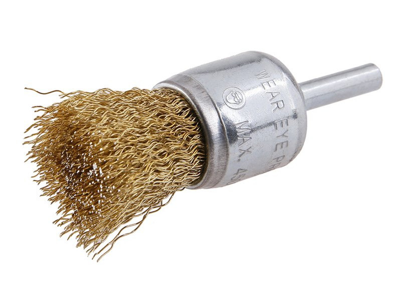 Rotary brush - wavy, FESTA brushes guarantee high-quality materials and processing, wire 0.3 mm - brass-plated diameter 25 mm, shank 6 x 20 mm, galvanized brush body, number of wires: 150, wire length: 20 mm, max. permissible revolutions: 4500 1/min, use: light sanding work and cleaning in hard-to-reach places, packaging: blister with euro hole.
