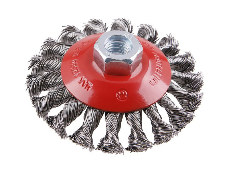 Rotary brush - cup, design: COPY - patented wire 0.5 mm - copy, do not unravel even under extreme load, diameter 100 mm, thread M14x2 mm, number of wires: 900, wire length: 23 mm, max. permissible revolutions: 12500 1 /min, use: removal of paint, rust, burrs, welding residues, slag, roughening, cleaning of metal parts, packaging paper box with euro hole.
