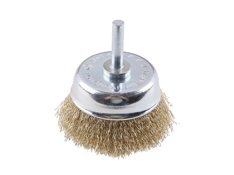 Rotary brush - cup, design: corrugated wire 0.25 mm - brass-plated, diameter 65 mm, shank 6 x 27 mm, galvanized brush body, number of wires: 1512, wire length: 18.5 mm, max. permissible revolutions: 4500 1/ min, use: for polishing, roughening, removing rust and burrs, packaging: blister with euro hole.