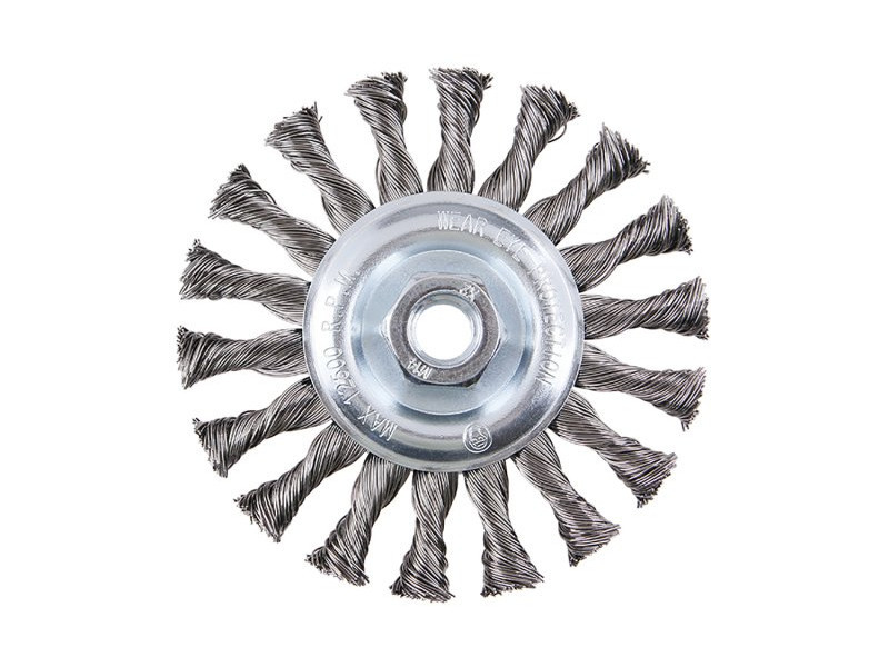 Rotary brush - radial, version: COPY - patented wire 0.5 mm - copy, does not unravel even under extreme load, FESTA brushes guarantee high-quality materials used and processing, diameter 115 mm, thread M14x2mm, galvanized brush body, number of wires: 900, wire length: 27 mm, max. permissible revolutions: 12500 1/min, use: removal of paint, rust, burrs, welding residues, slag, roughening, cleaning of metal parts, packaging: paper box with euro hole.