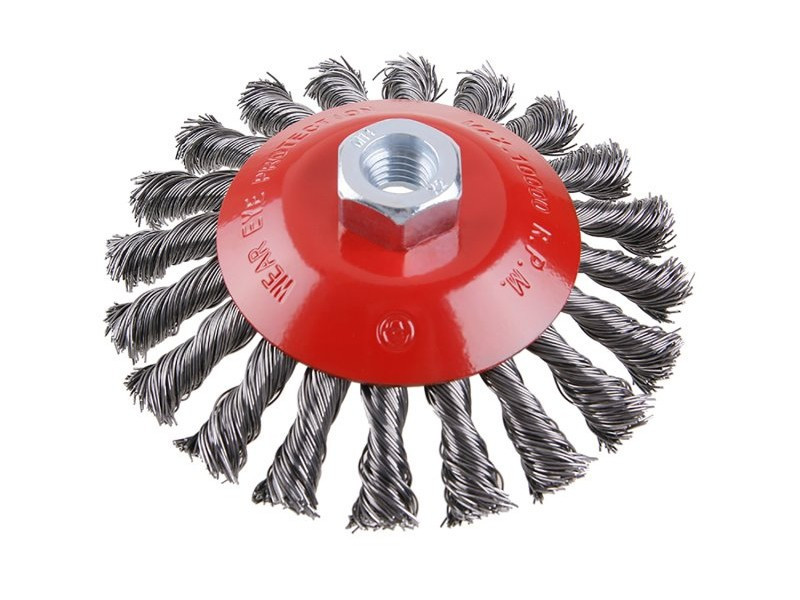 Rotary brush - cup, design: COPY - patented wire 0.5 mm - copy, do not unravel even under extreme load, diameter 125 mm, thread M14x2 mm, number of wires: 900, wire length: 23 mm, max. permissible revolutions: 12500 1 /min, use: removal of paint, rust, burrs, welding residues, slag, roughening, cleaning of metal parts