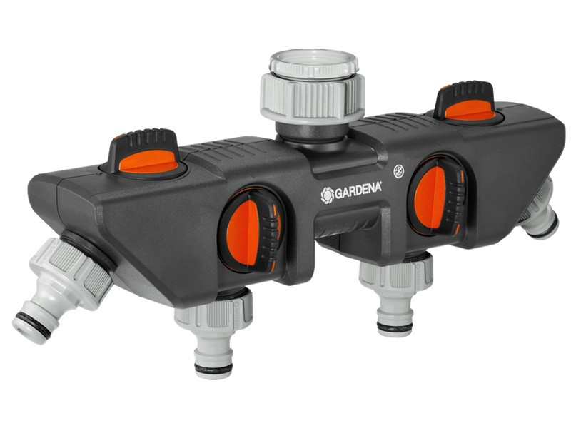 Több csatlakozó berendezés üzemeltetéséhez. 4 fokozatmentesen szabályozható csap. 2 GARDENA öntözőkomputer vagy öntözőóra csatlakoztatható hozzá. GARDENA Profi-Systemre átszerelhető GARDENA Profi-System csapelem segítségével (cikksz. 2801). Színes fóliás kártya. 26,5 mm-es (G 3/4) vízcsaphoz 33,3 mm-es (G 1) menettel és 21 mm-es (G 1/2) vízcsaphoz 26,5 mm-es (G 3/4) menettel.
