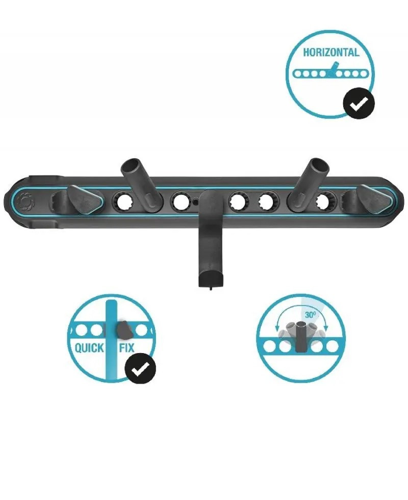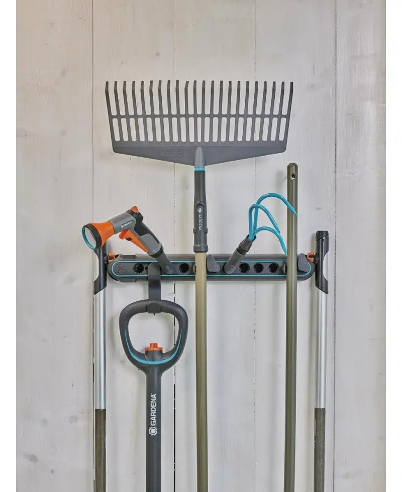 A GARDENA Szerszámtartó Flex ideális és helytakarékos tárolást biztosít a hagyományos kerti szerszámok, valamint a combisystem tartozékok és nyelek számára. A szerszámtartó két tárolóval van felszerelve. Kis kampók a metszőollók, ollók és más kisebb kerti szerszámok tárolására. A rugalmas, szabadon csatlakoztatható szerszámtartók 30°-os lépésekben elforgathatók, hogy az igényeidhez igazítsd őket. A tartók kompatibilisek a GARDENA combisystem tartozékokkal és az Original GARDENA Systemmel is. Ezenkívül két nyéltartót és egy univerzális kampót is tartalmaz a kerti szerszámokhoz, például ásókhoz. Igény esetén a Flex Szerszámfejtartó betéttel (cikkszám: 3507-20) és a Flex Nyéltartó betéttel (cikkszám: 3508-20) bővíthető. A szerszámtartó két GARDENA combisystem nyélnek kínál tárolóhelyet.