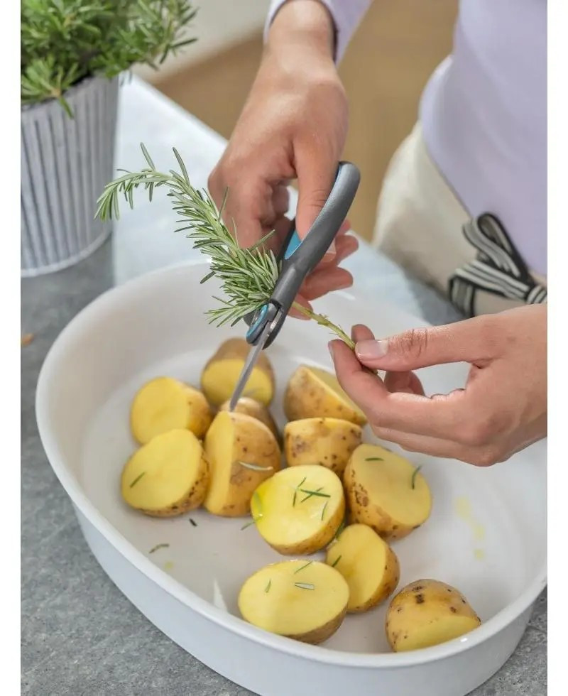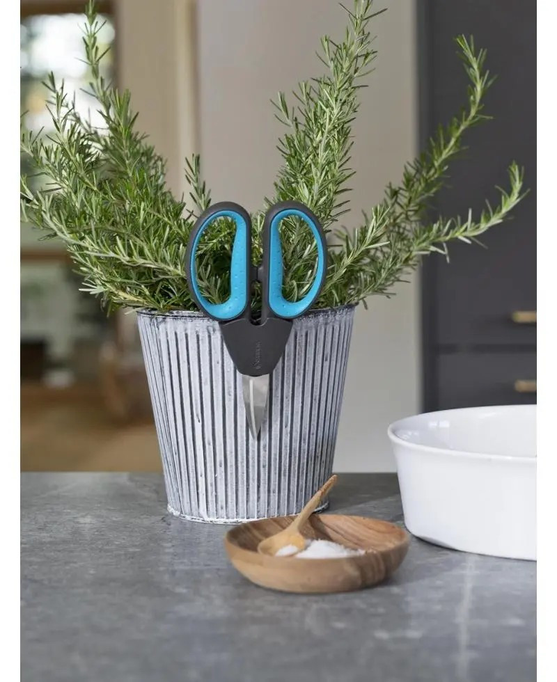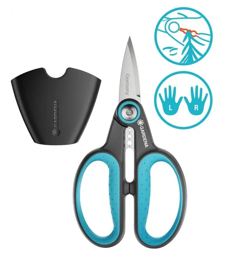 A GARDENA HerbCut fűszernövény ollóval megbízhatóan vághatod az olyan fás szárú fűszernövényeket, mint a rozmaring, a kakukkfű vagy a zsálya. A praktikus tokkal ellátott készletben a HerbCut azonnal kéznél van. A tartós és rozsdamentes acélból készült hegyes vágóélekkel sokáig pontosan vághatsz. A két markolat között három különböző méretű lyuk található, amelyek praktikus lombtalanítő funkcióval rendelkeznek. Például húzz át rajtuk egy rozmaringszárat, és egy mozdulattal távolítsd el az összes levelet. Ezután a fűszernövényeket azonnal felhasználhatod főzéshez vagy kiterítheted száradni. A fűszernövény olló egyaránt alkalmas jobb- és balkezeseknek, és az ergonomikus ErgoTec markolat mindig kényelmesen fekszik a kézben. A puha elemekkel ellátott csúszásmentes markolatok mindig biztos fogást biztosítanak. A HerbCut fenntarthatósága lenyűgöző, mivel a markolatok és a tok több mint 70%-ban újrahasznosított műanyagból készült. Az ollót mindig a helyén lesz, csak tedd a fűszernövény cserepéhez erősített tokba. Az olló alkalmas az élelmiszerekkel való érintkezésre, szagokat és ízeket nem ad ki, élelmiszer-biztos. Könnyen tisztítható és mosogatógépben mosható. A HerbCut egy Németországban készült minőségi termék