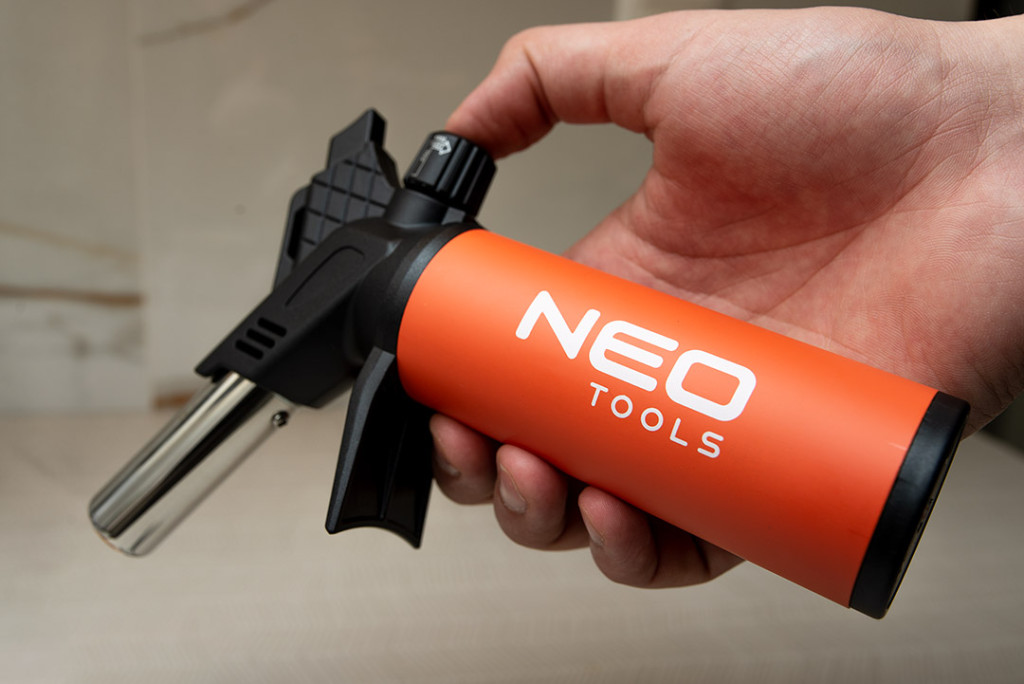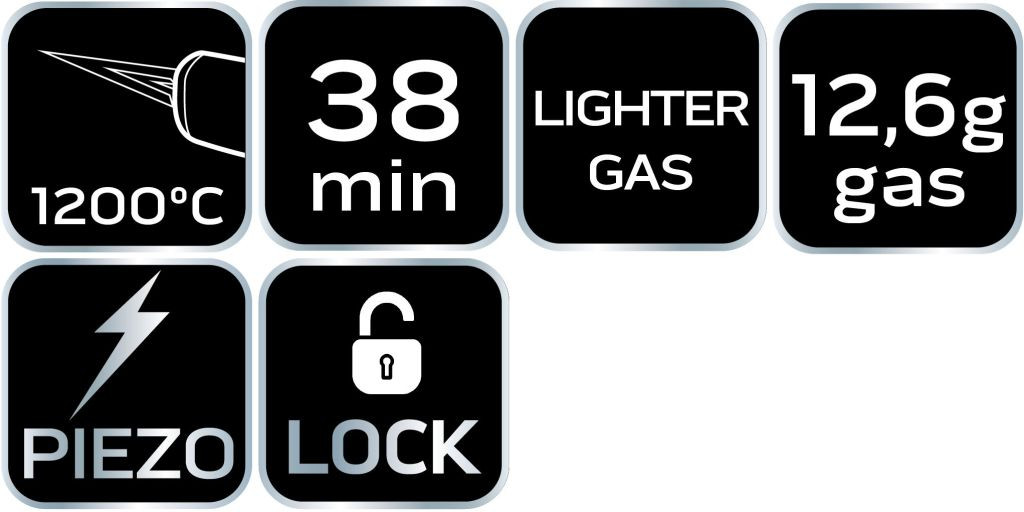 NEO 19-905 Gázforrasztó, gázégő piezo gyújtással. Praktikus, folyamatos üzemű funkcióval és záró kapcsolóval ellátott készülék. 12,6 g tárkapacitással rendelkezik. Piezo gyújtással aktiválható. A stabil talp megkönnyíti a feladatokat és növeli a készülék lehetőségeit. Működési hőmérséklete 1200 °C. A gázforrasztó tökéletes a precíziós munkához. Szakembereknek és barkácsolóknak ajánlott.