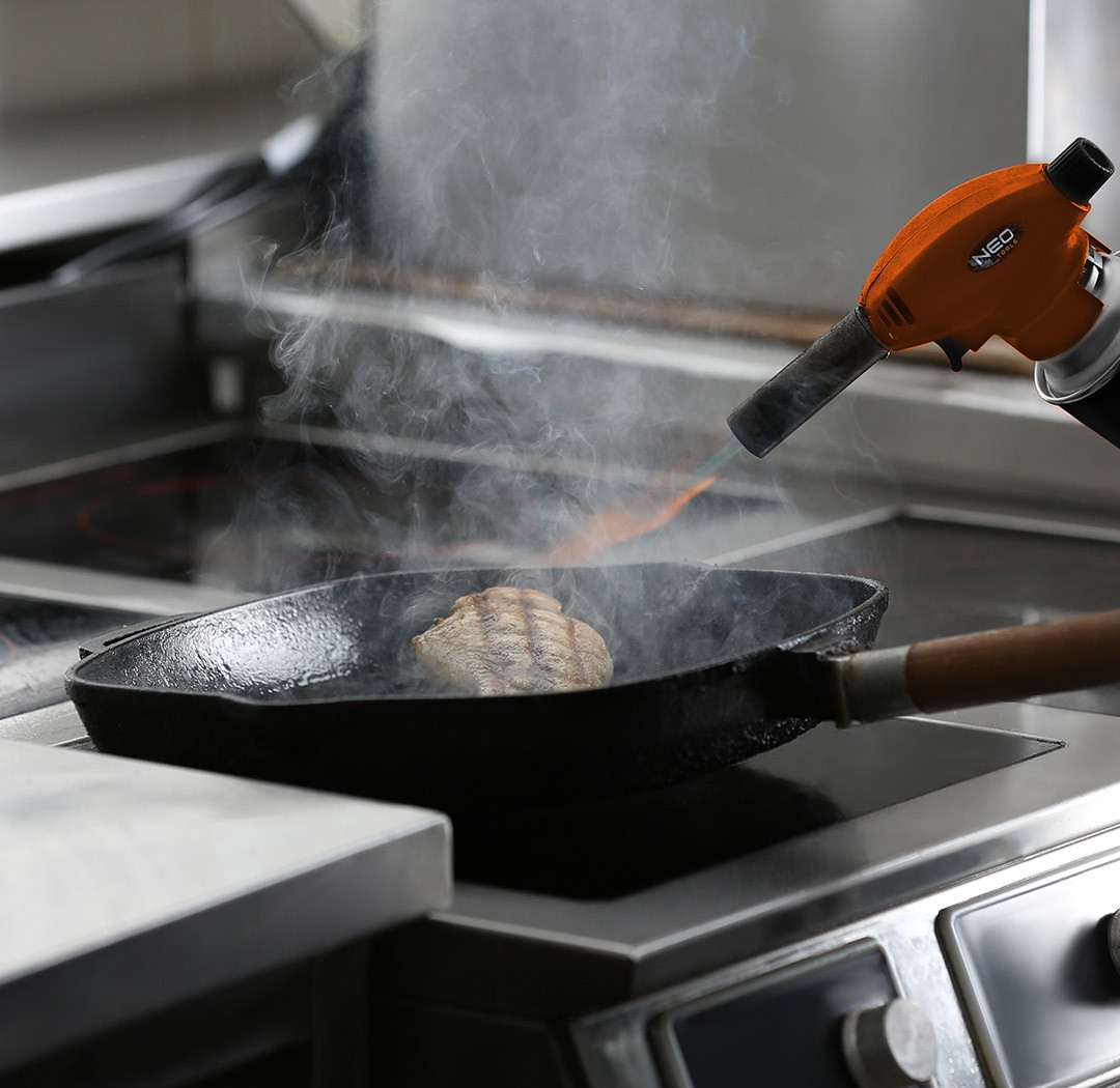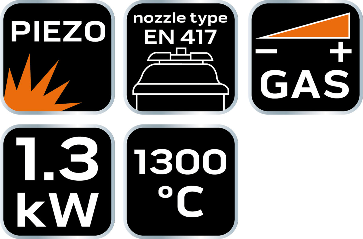 Gázforrasztópisztoly 227 g-os patronokhoz (EN 417 típus), piezo gyújtású, függőleges működéshez (+/- 80 fok), üzemi hőmérséklet 1300 ° C, teljesítmény 1,3 kW, átlagos gázfogyasztás 80 g / h, műanyag ház pillanatnyi gyújtás gombja .