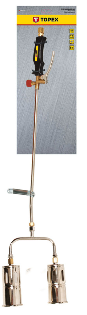TOPEX bádogos forrasztó készlet, 110 kW teljesítmény, 1850 °C üzemi hőmérséklet. Készlet tetőfedési munkákhoz. Felszerelése 2 égőfej, hosszú, 50 cm-es szár, valamint hosszú, 5 m-es tömlő. A hosszú szár javítja a munkavégzés kényelmét és biztonságát. A TOPEX márka ezermestereknek készül.