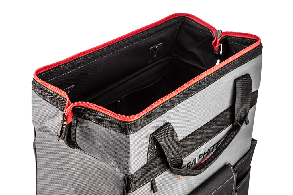 GRAPHITE gurulós géptartó táska Energy+ akkus és hálózati gépekhez, tartozékokhoz. Űrtartalma 42 l. Nagy szövetsűrűségű, a kopásnak jól ellenálló anyagból készül. A belső oldalon laminált poliészter anyag óvja a táska tartalmát a nedvességtől és a kedvezőtlen időjárási körülményektől. 1 belső, 11 külső zsebbel rendelkezik.. A táska alja merevített, vízálló, talpakkal és kerekekkel rendelkezik, mely a nehéz munkakörülmények között is védi a táska tartalmát A táska méretei lehetővé teszik több elektromos szerszám és tartozékainak (akkumulátor, akkutöltő, külön kiszerelés) komfortos hordozását.