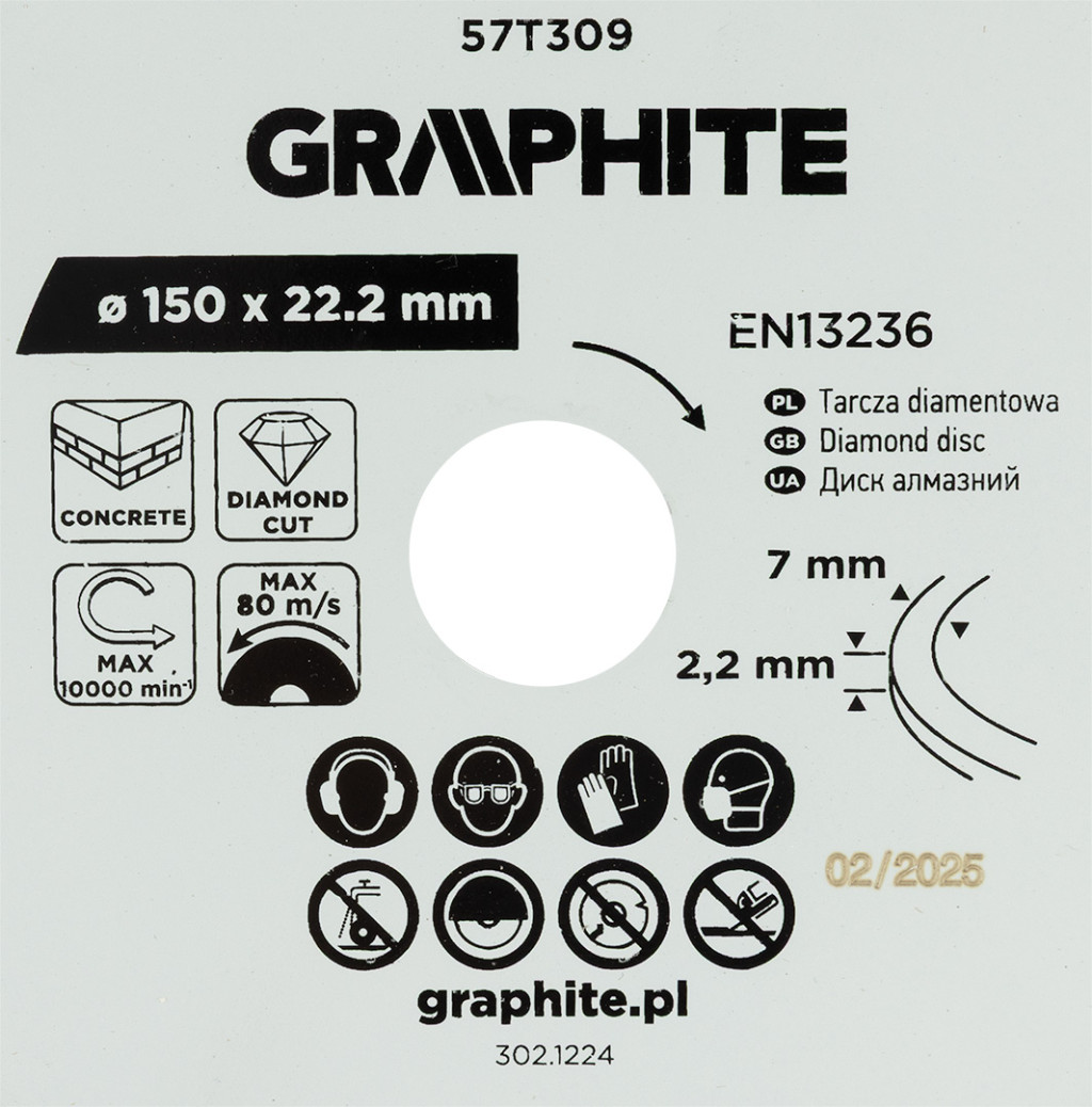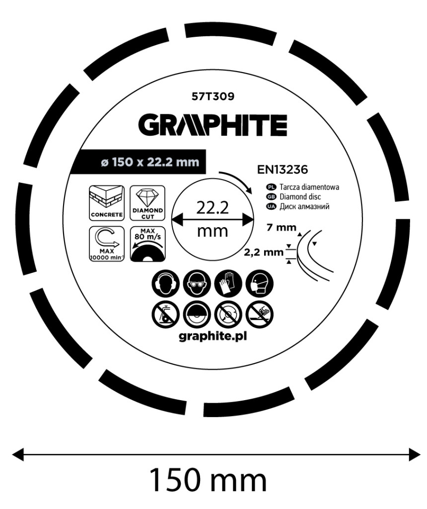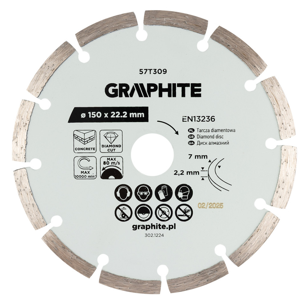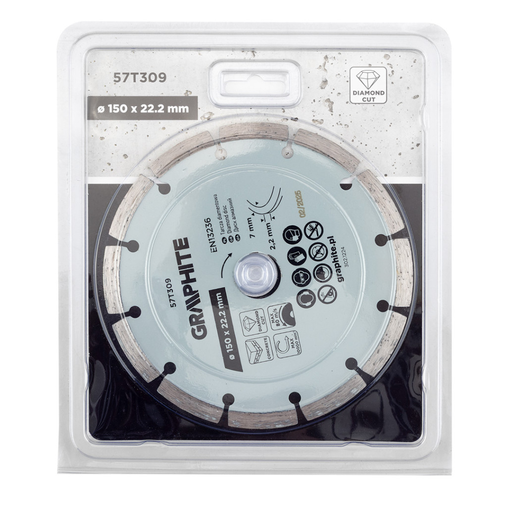 GRAPHITE 57T309 Gyémánt vágókorong 150x22,2mm szegmentált, száraz. Praktikus redukciós gyűrűt tartalmaz. A vágószegmens 7 mm magas és 2,2 mm széles. A tárcsa maximális sebessége 10 000 fordulat/perc, ami 80 m/s-nak felel meg. A GRAPHITE tárcsa megfelel az EN 13236 szabvány követelményeinek, és gránit, beton, tégla, kő és márvány vágására készült.