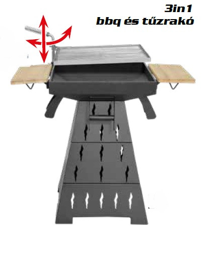 Faszén grill Forgó rács Állítható magasságú rács Rozsdamentes acél rostély Robusztus fémszerkezet Két fa tárolóhely Grillező és kandalló Méretek 88 x 73 x 95 cm hossz (mm)720 magasság (mm)950 szélesség (mm)880