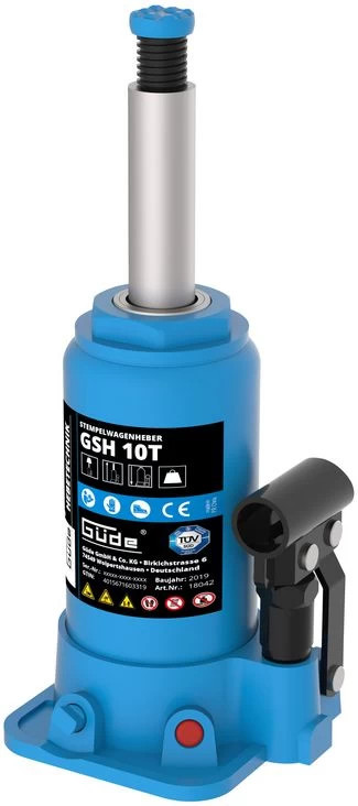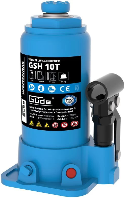 kiváló minőségű acélból készült hidraulikus henger- sokoldalú felhasználás, pl. műhelyben és garázsban- az Ön biztonsága érdekében - GS tesztelve!- speciális öntöttvasból készült nagy lábtányér a biztonságos álláshoz- sima járású szivattyú lengőkar- 3-részes szivattyúkar szelepvezérléshez illeszkedő illesztéssel- hornyolt kosárlemez a jobb fogás érdekében- külön állítható orsóA Güde GSH 10T dugattyúemelő új szinten határozza meg a megbízhatóság és a biztonság fogalmát. Kiváló minőségű acélból készült hidraulikus hengerével ideális eszköz a legkülönbözőbb feladatokhoz, különösen műhelyekben és garázsokban. GS-engedélyes pecsétje szigorú biztonsági előírásokról és a legmagasabb minőség iránti elkötelezettségről tanúskodik. A speciális öntöttvasból készült nagyméretű talplemez szilárd és stabil állást garantál még nagy terhelés esetén is. A sima járású szivattyúbillentő kar, amelyet a szelepvezérléshez speciálisan illeszkedő, 3 részes szivattyúkar egészít ki, precíz emelést és leengedést tesz lehetővé. További fogást biztosít a hornyolt kosárlemez, amely gyakorlatilag kiküszöböli a teher megcsúszását. Az orsó különálló beállításának lehetősége a felhasználók számára nagyobb rugalmasságot biztosít a különböző alkalmazási forgatókönyvekhez. Röviden, a Güde GSH 10T egy nélkülözhetetlen, nagy teljesítményű eszköz mindazok számára, akik nem akarnak kompromisszumot kötni a minőség és a biztonság terén. Műszaki adatok Emelőerő: 10 t min. Magasság: 195 mm max. magasság: 375 mm Ø terhelési lemez: 35 mm Hosszúság: 120 mm Széles: 110 mm Magasság: 195 mm Logisztikai adatok Csomagolási méretek Hosszúság 135 mm Széles 120 mm Magasság 210 mm Nettó súly: 5,7 kg Bruttó tömeg: 5,9 kg GTIN: 4015671603319 Cikkszám: 18042