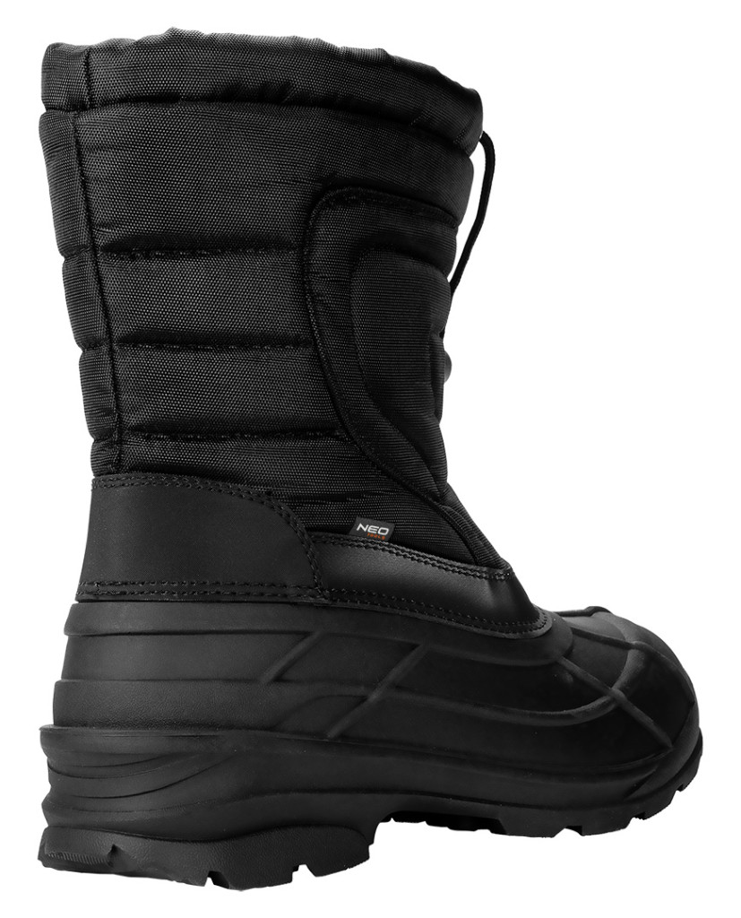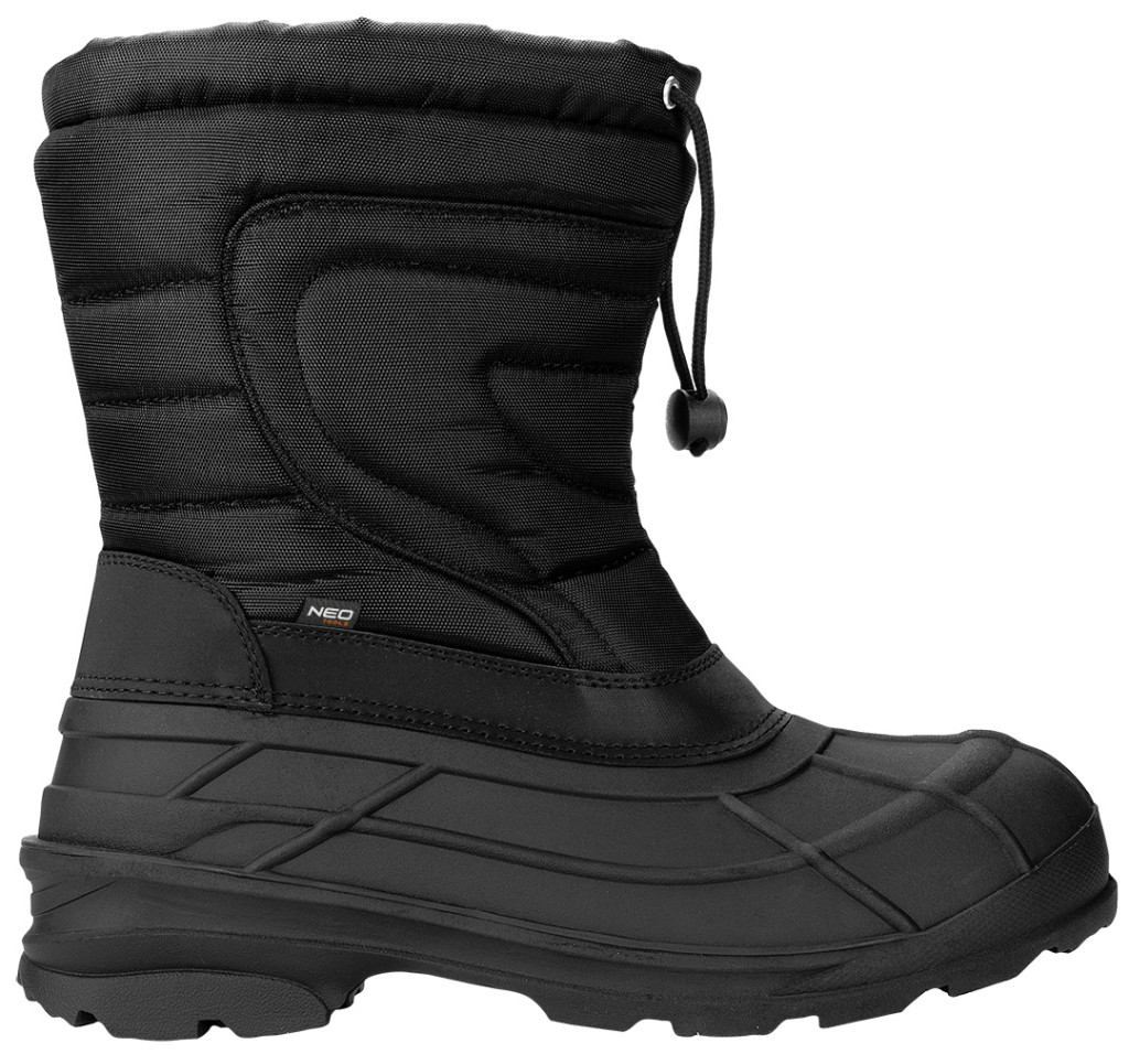 Férfi hótaposó csizma, összehúzható szárral, poliészter szövetből és TPR gumiból készült lábbeli. A hótaposó csizma szigetelt és ellenáll a fagynak is. Speciális kialakításuknak köszönhetően lehetővé teszi, hogy a lábfej simán belecsússzon a cipőbe. Felső része húzózsinórral ellátott, amely lehetővé teszi a méret kényelmes beállítását. A NEO hótaposó csizmák ellenállnak a hónak és a víznek. A csúszásmentes talp biztonságot nyújt a jeges felületeken. A csizma javítja a téli munkavégzés kényelmét. Hasznos lesz például a hó eltakarításakor a járdáról és minden téli munka elvégzéséhez.