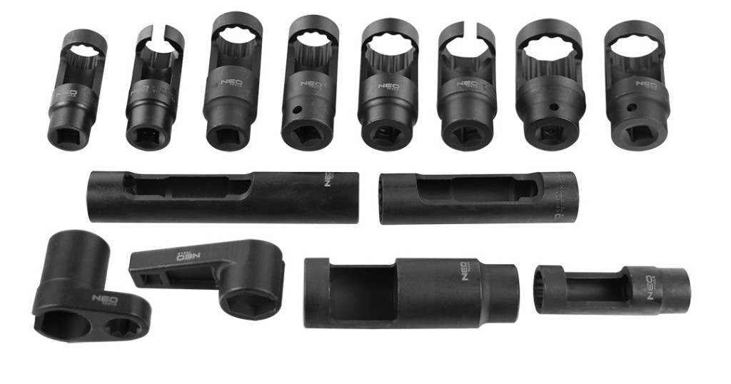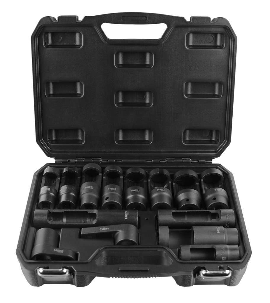 Lambda-szonda és porlasztócsúcs szerelő készlet, 14 db-os A NEO 11-880 készlet azoknak a szakembereknek készült, akik értékelik a minőséget és a kényelmet. A készlet tizenkét szögű, hatszögű, hajlított dugókulcsot és tizenkét szögű porlasztócsúcs dugókulcsot tartalmaz. A készlet egy kényelmes, szolid hordtáskában található, amely segít fenntartani a rendet a műhelyben.