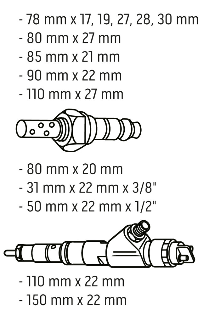 Tizenkét szögletű, 1/2" lambdaszonda dugókulcsok: 78 mm x 17, 19, 27, 28, 30 mm: 80 mm x 27 mm: 85 mm x 21 mm: 90 mm x 22 mm: 110 mm x 27 mm