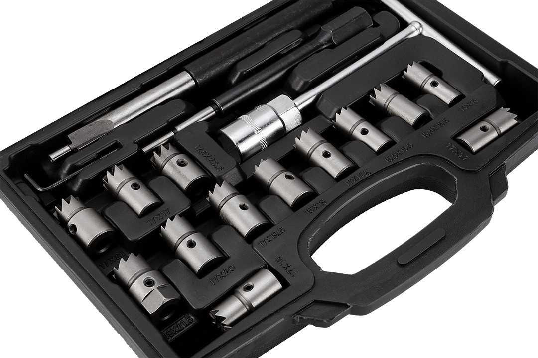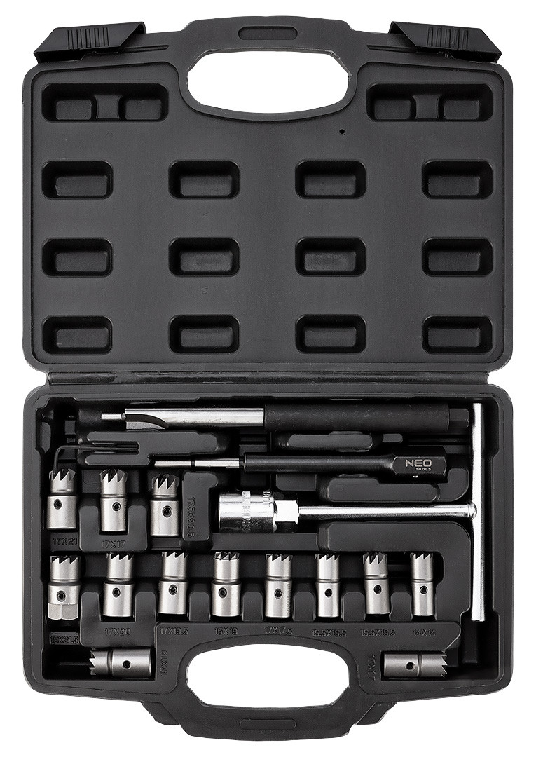 Porlasztófészek-tisztító marófejkészlet, 17 db-os, 11-885, NEO TOOLS - a porlasztófészek lerakódásainak eltávolítására szolgáló készlet. Megkönnyíti a porlasztó fészekbe szerelését. Kompatibilis a személyautók többségével. Kofferbe csomagolt készlet