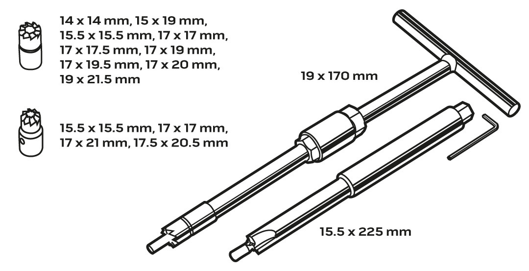 - lapos bővítő - 14 x 14 mm, 15 x 19 mm, 15.5 x 15.5 mm, 17 x 17 mm, 17 x 17.5 mm, 17 x 19 mm, 17 x 19.5 mm, 17 x 20 mm, 19 x 21.5 mm