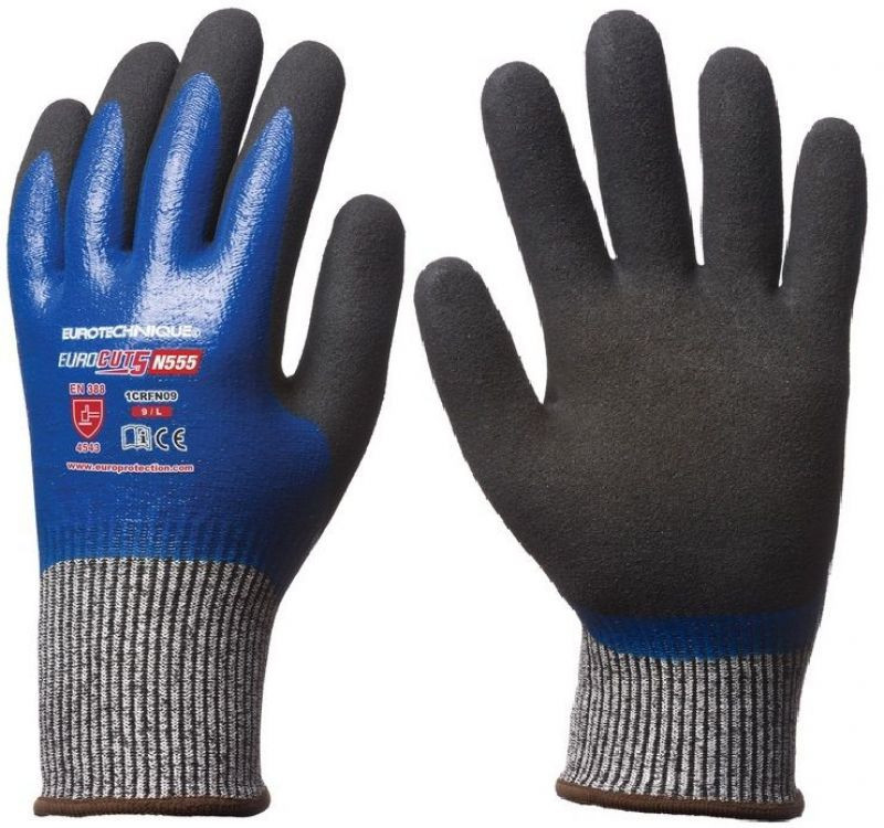EUROCUT 5 VÁGÁSBIZTOS, VÉGIG KÉK NITRIL + SANDY CSB RÉTEG_8EUROCUT 5 N555 TELJESEN NITRIL MÁRTOTT KESZTYÛ: 13-as kötésû, legmagasabb színtû szakítás- és kopásállóságú, szúrásbiztos illetve maximális 5-ös szinten vágásbiztos HPPE (high performance PE) + üvegszál alapanyagú védõkesztyû hátrészen végig kék sima nitril mártás + a tenyerén fekete speciális Sandy csúszásbiztos nitril réteg a mártás kiválóan véd zsírok, olajok hatása ellen, a dupla réteg megnöveli a kesztyû élettartamát könnyû, kifejezetten kényelmes, teljesen kézre simuló formai kialakítás, extra csúszásbiztossággal olajos környezetben is gumírozott, rugalmas mandzsetta megakadályozza a kéz szennyezõdését széles méretszortiment MÉRET: 8-as CSOMAGOLÁS: 50/5 páranként külön csomagolva EU szabvány: EN 420:2003 + A1:2009, EN 388:2003 4543