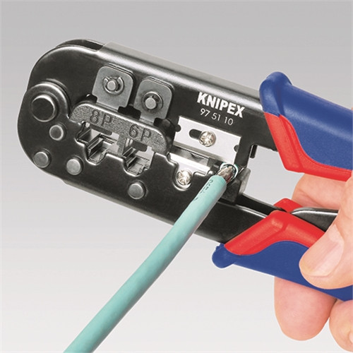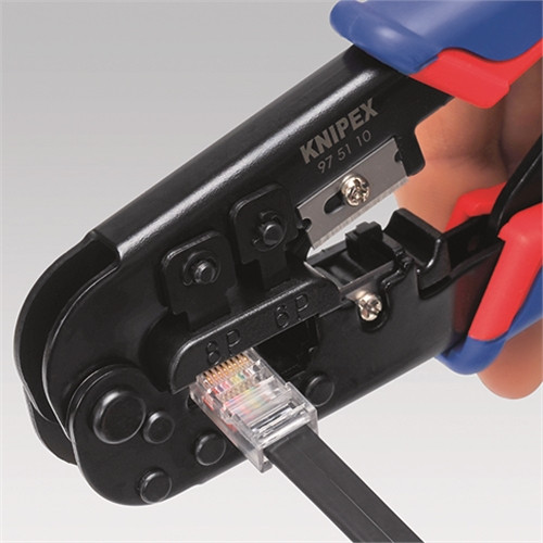 RJ 11/12 típusú (9,65 mm széles) és RJ 45 típusú (11,68 mm széles) 6- és 8 pólusú Western dugók préseléséhez.