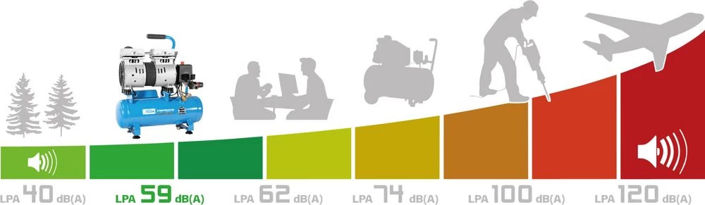 • olaj- és karbantartásmentes, csendes kompresszor az Air Power sorozatból • suttogóan csendes - a hangnyomásszint csak 59 dB(A)ster csendes - a hangnyomásszint csak 59 dB(A) • energiatakarékos 2 hengeres egység • közvetlen meghajtású • mechanikus nyomáskapcsoló • nyomáscsökkentő - könnyen beállítható üzemi nyomás az üzemi nyomás könnyű beállítása • manométer - az üzemi nyomás kényelmes leolvasása • 1 sűrített levegő csatlakozó • biztonsági szelep és kondenzátum leeresztő dugó • gumipufferek biztosítják a biztonságos állást • biztonsági szelep és kondenzátum leeresztő dugó • gumipufferek biztosítják a biztonságos állást. • Praktikus szállítási fogantyú • Kiváló minőségű 6 literes tartályAz Airpower 105/8/6 Silent kompresszor kompakt kialakításával és alig hallható működési zajával nyűgöz le. A közvetlen meghajtású, olaj- és karbantartásmentes kéthengeres egység működés közben mindössze 59 dB(A) hangnyomásszintet produkál, és így lényegesen csendesebb, mint sok más kompresszor. A 6 literes acéltartály tárolja a sűrített levegőt, így a kompresszornak nem kell folyamatosan működnie. A kompakt kialakítás, a könnyű saját tömeg és a tartályhoz csatlakoztatott praktikus szállítási fogantyú a lehető legnagyobb mobilitást biztosítja. A további felszerelés tartalmaz egy könnyen leolvasható munkamanométert a nyomás leolvasásához, egy mechanikus nyomáskapcsolót, valamint egy sűrített levegős csatlakozót a sűrített levegős berendezés gyors csatlakoztatásához. Műszaki adatok Hálózati feszültség: 230 V Frekvencia: 50 Hz Motorteljesítmény (P1): 550 W Működési mód: S3 50% Védelmi osztály (IP): 20 Aggregátum: ölfrei Motor fordulatszám: 1450 1/min Kompresszor fordulatszám: 1450 min-1 Befogadó kapacitás: 105 l/min eff. Szállítási mennyiség 0 bar: 94 l/min eff. Szállítási mennyiség 4 bar: 53 l/min eff. Szállítási mennyiség 7 bar: 38 l/min max. nyomás: 8 bar Kazán kapacitása: 6 l Hengerek száma: 2 Légcsatlakozók száma: 1 Nyomásmérő: 1 Csatlakozó kábel hossza: 180 cm Kábel típusa: H05VV-F Zajérték LWA: 79 dB Hangnyomásszint LPA: 59 dB Hosszúság: 420 mm Széles: 200 mm Magasság: 500 mm Logisztikai adatok Csomagolási méretek Hosszúság 480 mm Széles 190 mm Magasság 520 mm Nettó súly: 14,5 kg Bruttó tömeg: 15,6 kg GTIN: 4015671512406 Cikkszám: 50133