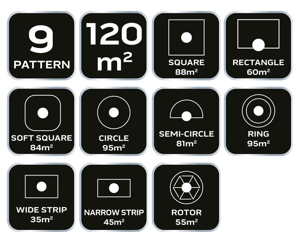 Köresőztető, öntöző, 15-780, NEO - gyepek, kertek és művelt területek öntözésére szolgál. 9 funkcióval rendelkezik, amelyek lehetővé teszik a különböző formájú és méretű területeken lévő növények egyidejű öntözését. A beállítható esőztetési lehetőségek: négyzet (88 m²), téglalap (60 m²), négyzet lekerekített sarkokkal (84 m²), kör (95 m²), félkör (81 m²), gyűrű (95 m²), széles szalag (35 m²), keskeny szalag (45 m²), rotor (55 m²).