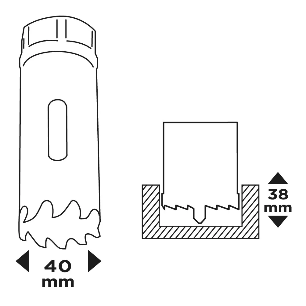 A GRAPHITE 56T709 40 mm-es bimetál lyukfűrésze 44 mm-es magasságával 38 mm mélységig fúrható. HSS nagysebességű acélból készül, és 5/8'' x 18 UNF menettel van ellátva. Fém, rozsdamentes acél (Inox), öntöttvas, sárgaréz, alumínium és fa megmunkálására tervezték. A GRAPHITE lyukfűrészt a 32-152 mm-es tartományban lévő bimetál lyukfűrészekhez ajánlott az 56T754 adapterrel és a kísérleti fúrószárral együtt használni. A szerszám maximális fordulatszáma az anyagtól függően változik: acél - 220 fordulat/perc, Inox acél - 110 fordulat/perc, alumínium - 330 fordulat/perc, fa - 290 fordulat/perc, öntöttvas - 145 fordulat/perc, sárgaréz - 290 fordulat/perc. A bimetál lyukfűrészt fúrógép vagy csavarozógép segítségével történő használatra tervezték.