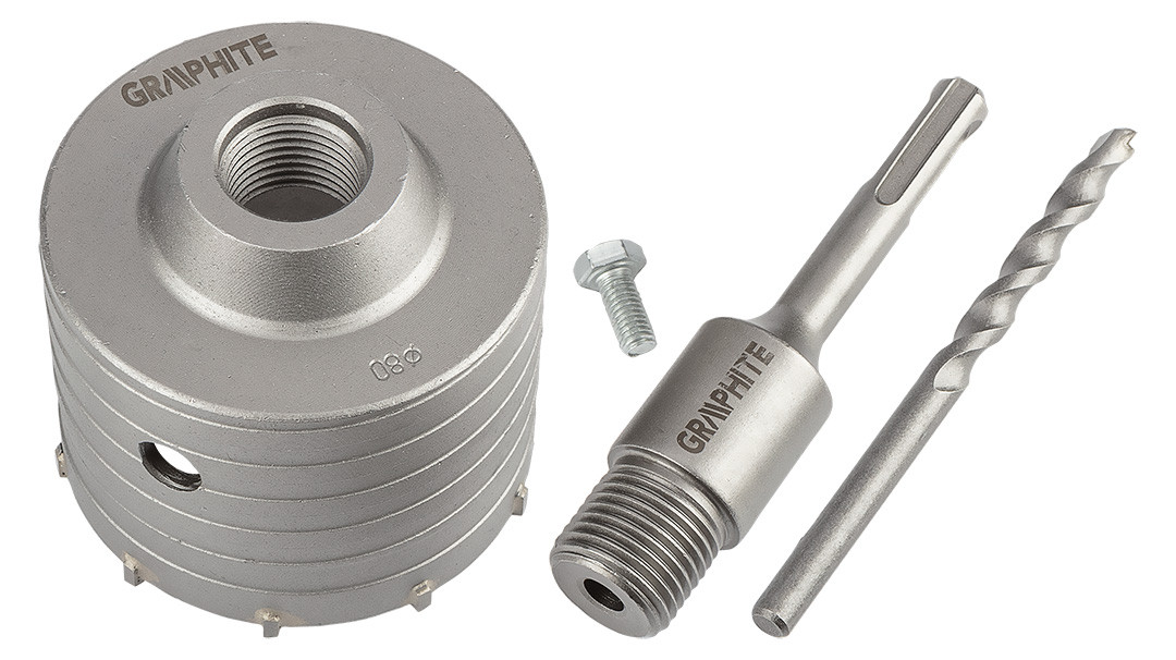 A80 mm-es koronafúró SDS+ adapterrel és központfúróval 55H322 GRAPHITE megbízható szerszám, amely számos alkalmazásban bizonyítja értékét. A volfrámkarbid pengékkel felszerelt körkivágó ideális beton és tégla lyukak fúrásához. Sokoldalú felhasználási lehetőségei közé tartozik az is, hogy ezekből az anyagokból készült falakba csatlakozó dobozok számára furatokat készítsünk.