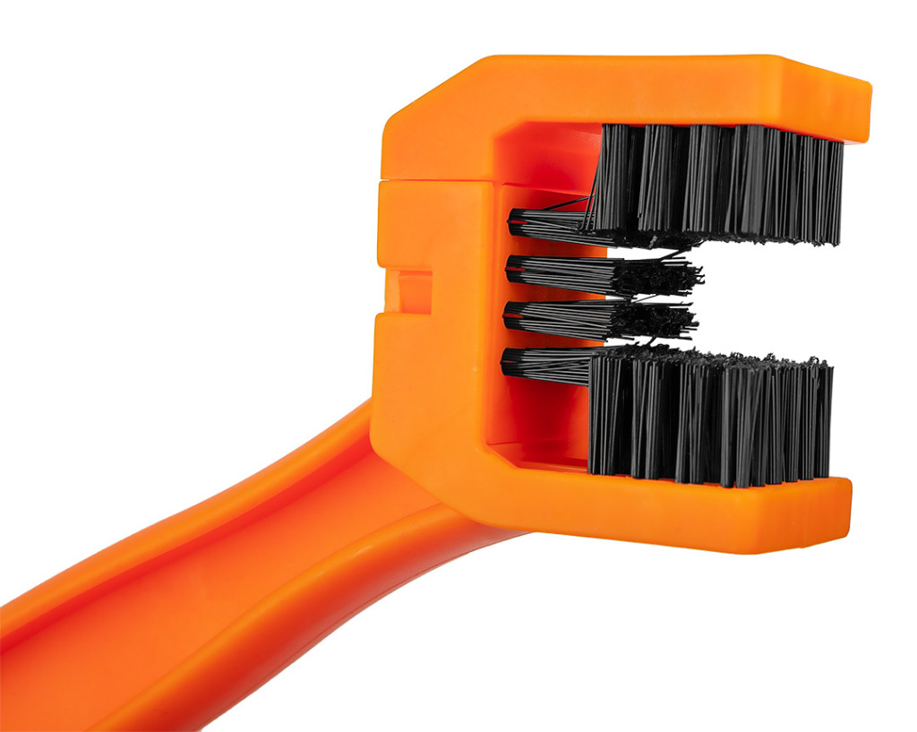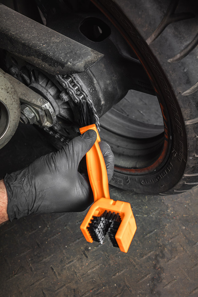 NEO 10-509 lánctisztító kefe. Egy speciális műanyag kefe motorkerékpárok, quadok, kerékpárok, gépek hajtóláncának tisztítására. Egyik oldala U alakú a precíziós tisztításhoz, a másik, egyenes oldala pedig a nehezen hozzáférhető helyek eléréséhez lett kialakítva. A kefe hossza 24,5 cm. Speciális folyadékokkal ajánlott használni, hogy segítsen megszabadulni a makacs portól, homoktól vagy régi zsírtól, megőrizve a lánc hosszú élettartamát. Ne feledje, hogy a tisztítást leállított motornál végezze, és viseljen kesztyűt és védőszemüveget.