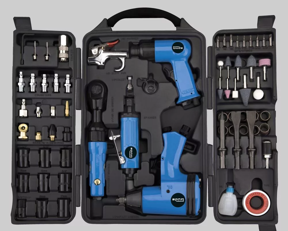 - 2 ajtós műanyag tok- Falra szerelhető és hordozható fogantyú- Ütvecsavarhúzó készlet ½"- 3/8" racsnis csavarhúzó- 8 dugókulcs- Vésőkalapács- 3 véső- 1 vésőrugó- 6 mm-es csiszológép- 3 mm-es csiszolócsap hüvely- 3 csiszolóhegy 6 mm- 5 csiszolópont 3 mm- Csiszolóhenger-tartó 6 mm- 10 csiszolóhenger- Sűrített levegő pisztoly mini- Kifúvó fúvóka- 2 légkamra töltő adapter- 2 golyós töltőtű- 2 tűadapter- 5 tüskés szerelvény ¼" AG- 1 tüskés szerelvény 3/8" IT- Szelepdugó rögzítés- 5 mm-es imbuszkulcs- Olajpalack- Tömítőszalag- Feszítőkulcs- Tömlőcsatlakozó 3/8" ITNagyon praktikus és sokoldalú sűrített levegős szerszámkészlet széleskörű tartozékokkal, amelyek egyetlen műhelyből sem hiányozhatnak. A készlet tartalmaz egy ütvecsavarkulcsot és a hozzá tartozó dugókulcsokat az éves kerékcseréhez, valamint egy racsnis kulcsot egyéb szerelési és javítási munkákhoz. Továbbá egy vésőkalapács és egy kifúvópisztoly a megfelelő tartozékokkal és szerszámokkal együtt a szállítási terjedelem részét képezi. Végül egy pneumatikus csiszológép csiszolókővel és csiszolópapír tartozékokkal a finom munkákhoz teszi teljessé a készletet. Természetesen egy sűrített levegős olaj és egy tömítőszalag a sűrített levegős bimbók csatlakoztatásához szintén a szállítási terjedelem részét képezi. Műszaki adatok Sűrített levegős ütvecsavarozó Csatlakozó menet: 1/4 " Üzemi nyomás: 6 bar Levegőigény: 310-500 l/min maximális nyomaték: 310 Nm Sebesség üresjáratban: 8000 1/min A szerszámtartó mérete: 1/2" Pneumatikus vésőkalapács Csatlakozó menet: IG 1/4 " Üzemi nyomás: 6 bar Levegőigény: 350 l/min Ütésszám: 3000 min-1 Pneumatikus racsnis csavarhúzó Csatlakozó menet: 1/4 " Üzemi nyomás: 6 bar Levegőigény: 310 l/min maximális nyomaték: 81 Nm Sebesség üresjáratban: 160 1/min A szerszámtartó mérete: 3/8" Pneumatikus egyenes köszörű Csatlakozó menet: 1/4 " Üzemi nyomás: 6 bar Levegőigény: 350 l/min Sebesség üresjáratban: 22000 1/min Hosszúság: 458 mm Széles: 105 mm Magasság: 475 mm Logisztikai adatok Csomagolási méretek Hosszúság 286 mm Széles 110 mm Magasság 475 mm Nettó súly: 8 kg Bruttó tömeg: 8,2 kg GTIN: 4015671404015 Cikkszám: 40401