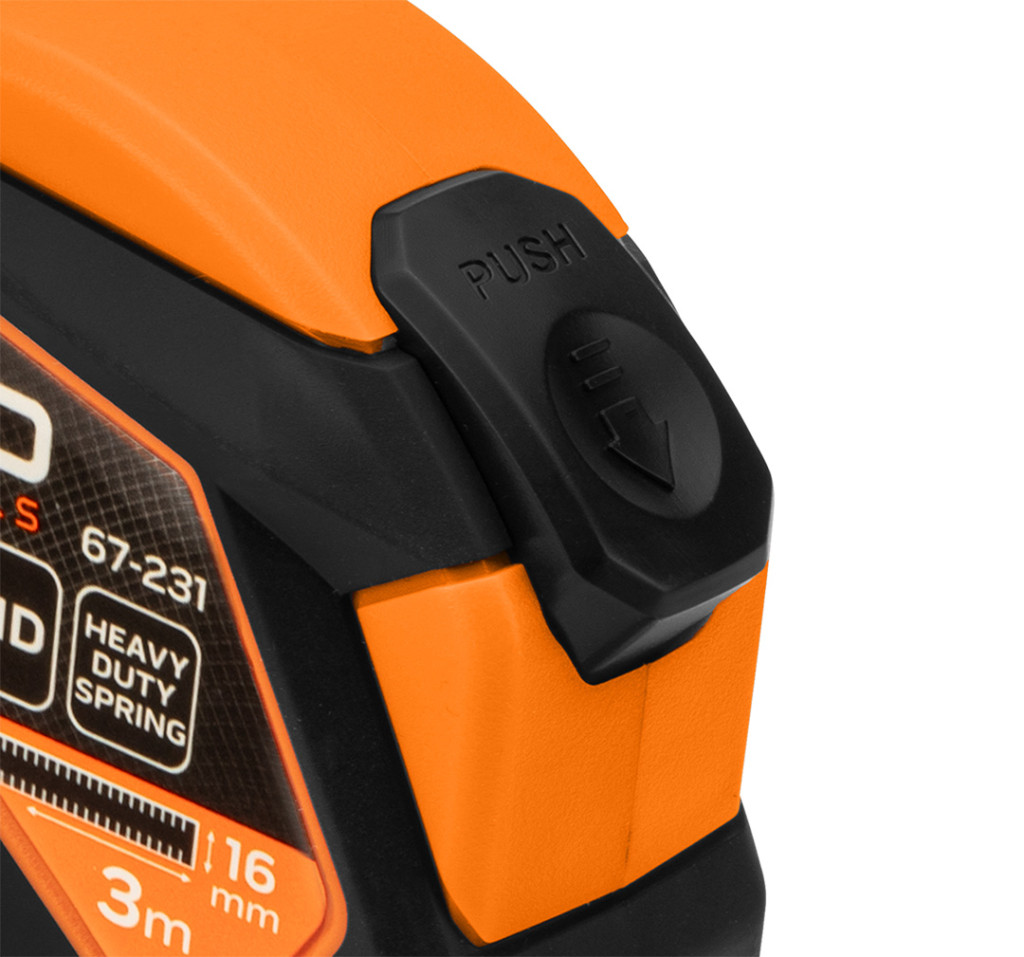NEO TOOLS 3m hosszú, 16mm széles, acél gördülő mérőszalag, automatikus rögzítés, stop gomb, mágnes. Praktikus automatikus megállító funkcióval van felszerelve, amely megakadályozza, hogy a mérőszalag kinyújtáskor magától visszahúzódjon, valamint lehetőség van a reteszelés használatára. A mágnes megkönnyíti a mérőszalag jobb stabilizálását, a nagyított nyomtatás pedig befolyásolja a mérések leolvasásának sebességét. A NEO TOOLS mérőszalag két anyagból készült burkolatból készül. A szalag fényes bevonattal rendelkezik, amely védi a beosztást a kopástól. A beépített visszahúzás csillapító szabályozza a simább gördülési folyamatot. A szerszám megfelel a MID II. osztályú szabványnak. A csúszásmentes borítás hozzáadása hozzájárul a NEO TOOLS mérőszalag tartósságához és kényelmes használatához.