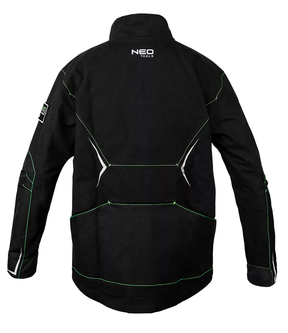 A NEO Premium PRO munkadzseki 100% Canvas pamut-425 g/m2 súlyú szövetből készül.A vállakon,a háton, az ujjakon és a zsebeken Cordura NYCO megerősítésekkel, ezért a dzseki ellenállóbb a mechanikai sérüléseknek. A munkadzseki fekete színű és kontrasztos neonzöld színnel van kombinálva. Elasztikus hálós béléssel, YKK cipzárral és 3M fényvisszaverő nyomatokkal rendelkezik. 12 zseb található rajta: 2 cipzáras mellzseb, 6 cipzáras-mágneses nyomógombos zseb, 2 kenguru típusú zseb és 2 további zseb a pulóver alján. A munkadzseki YKK fő cipzárját praktikus takarás fedi. A munkadzseki hosszúkás hátulja, valamint a belsejében cipzárral varrt rugalmas derékpánt lehetővé teszi, hogy a sorozatból származó nadrággal teljes öltözékké kombinálható legyen. Az ujjak alja belülről rugalmas anyaggall vannak ellátva. Megtalálható rajta egy tépőzáras tapasz is, amelyre saját logóját rögzítheti. Az azonosító címke megkönnyíti a munkahelyi azonosítást. A NEO márkát szakemberek és barkácsolók számára ajánljuk.