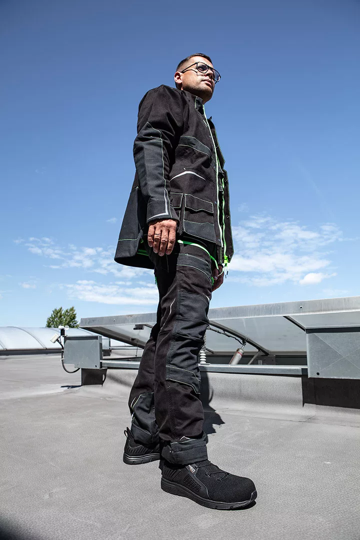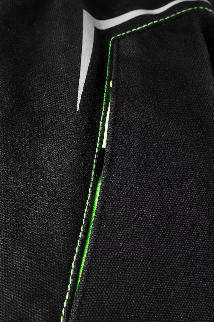 A NEO Premium PRO munkadzseki 100% Canvas pamut-425 g/m2 súlyú szövetből készül.A vállakon,a háton, az ujjakon és a zsebeken Cordura NYCO megerősítésekkel, ezért a dzseki ellenállóbb a mechanikai sérüléseknek. A munkadzseki fekete színű és kontrasztos neonzöld színnel van kombinálva. Elasztikus hálós béléssel, YKK cipzárral és 3M fényvisszaverő nyomatokkal rendelkezik. 12 zseb található rajta: 2 cipzáras mellzseb, 6 cipzáras-mágneses nyomógombos zseb, 2 kenguru típusú zseb és 2 további zseb a pulóver alján. A munkadzseki YKK fő cipzárját praktikus takarás fedi. A munkadzseki hosszúkás hátulja, valamint a belsejében cipzárral varrt rugalmas derékpánt lehetővé teszi, hogy a sorozatból származó nadrággal teljes öltözékké kombinálható legyen. Az ujjak alja belülről rugalmas anyaggall vannak ellátva. Megtalálható rajta egy tépőzáras tapasz is, amelyre saját logóját rögzítheti. Az azonosító címke megkönnyíti a munkahelyi azonosítást. A NEO márkát szakemberek és barkácsolók számára ajánljuk.
