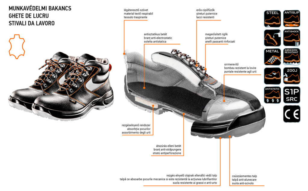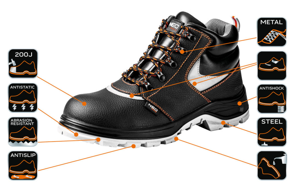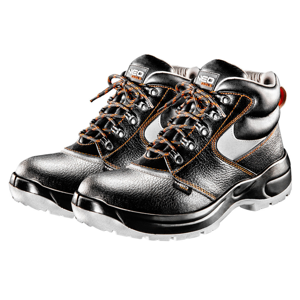 A NEO munkavédelmi magas szárú bakancs alapvető védőeszköz a munkavégzéshez. Felsőrésze kiváló minőségű bőrből készül, viselője láthatóságáról minden körülmények között gondoskodó fényvisszaverő betétekkel rendelkezik. A rezgéselnyelő rendszerrel ellátott csúszásmentes talp gondoskodik a kényelemről és a biztonságról. Az átszúrás ellen védő fém betét és a megerősített fém orrmerevítő véd a sérülések ellen. A lábbeli belső részének kialakítása magas fokú kényelmet biztosít a munkavégzés során. A CE jelölés a biztonság garanciája, bizonyítja, hogy a termék teljesít minden európai uniós követelményt. A NEO márka a professzionális igényeket is kielégíti.