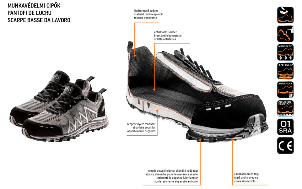 NEO Munkavédelmi cipő. A felsőrész lélegző anyagból készül. A gumival bevont, EVA habból készülő csúszásgátló talp kimagaslóan komfortos és hatékonyan csillapítja a rázkódást, garantálva a biztonságot és a kényelmet. A cipő belső részének puha kialakítása kényelmes viseletet biztosít.