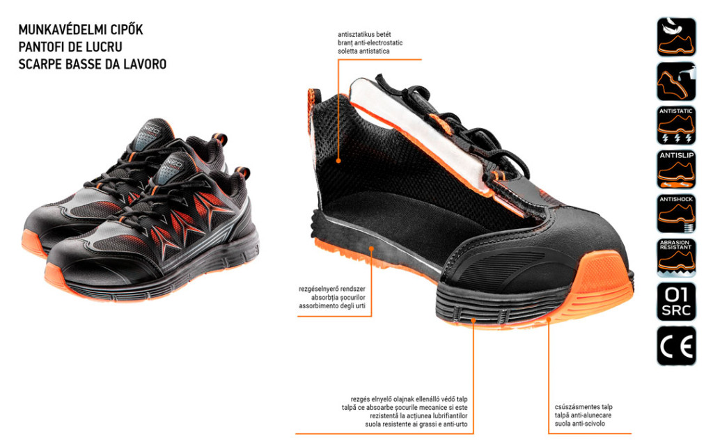 NEO Munkavédelmi cipő elengedhetetlen védéőeszköz a munkavégzéshez. A felsőrész lélegző anyagból készül. A gumival bevont, EVA habból készülő csúszásgátló talp kimagaslóan komfortos és hatékonyan csillapítja a rázkódást, garantálva a biztonságot és a kényelmet. A cipő belső részének puha kialakítása kényelmes viseletet biztosít.