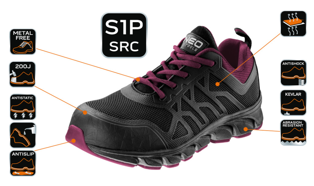 A 82-530 NEO típusú S1P SRC osztályú női munkavédelmi félcipő védi a lábat a hidegtől, a benedvesedéstől, valamint a beázástól. A lábbeli nagyon kényelmes, nem tartalmaz fém elemeket, ezért könnyebbek és nem zavarják meg a fémérzékelő kapukat. A termék ütéscsillapító rendszerrel ellátott Csúszásmentes talppal, kopásálló, olajokkal, benzinnel és más szerves oldószerekkel szemben ellenálló borítással, 200 j ütközésig védő üvegszálas orrbetéttel és átlyukasztás elleni Kevlar béléssel, valamint számos más előnnyel rendelkezik. A könnyű, divatos megjelenésű cipő CE-tanúsítvánnyal rendelkezik, megfelel az EN: ISO 20345: 2011 szabványnak.