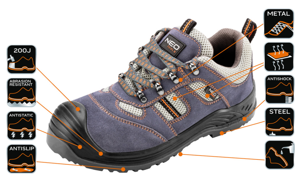 A NEO munkavédelmi cipő alapvető védőeszköz a munkavégzéshez. A felsőrész kiváló minőségű hasított bőrből készül. A lélegző textilbetétek jó szellőzést biztosítanak. A rezgéselnyelő rendszerrel ellátott csúszásmentes talp gondoskodik a kényelemről és a biztonságról. Az átszúrás ellen védő fém betét és a megerősített fém orrmerevítő véd a sérülések ellen. A lábbeli belső részének kialakítása magas fokú kényelmet biztosít a munkavégzés során. A CE jelölés a biztonság garanciája, bizonyítja, hogy a termék teljesít minden európai uniós követelményt. A NEO márka a professzionális igényeket is kielégíti.