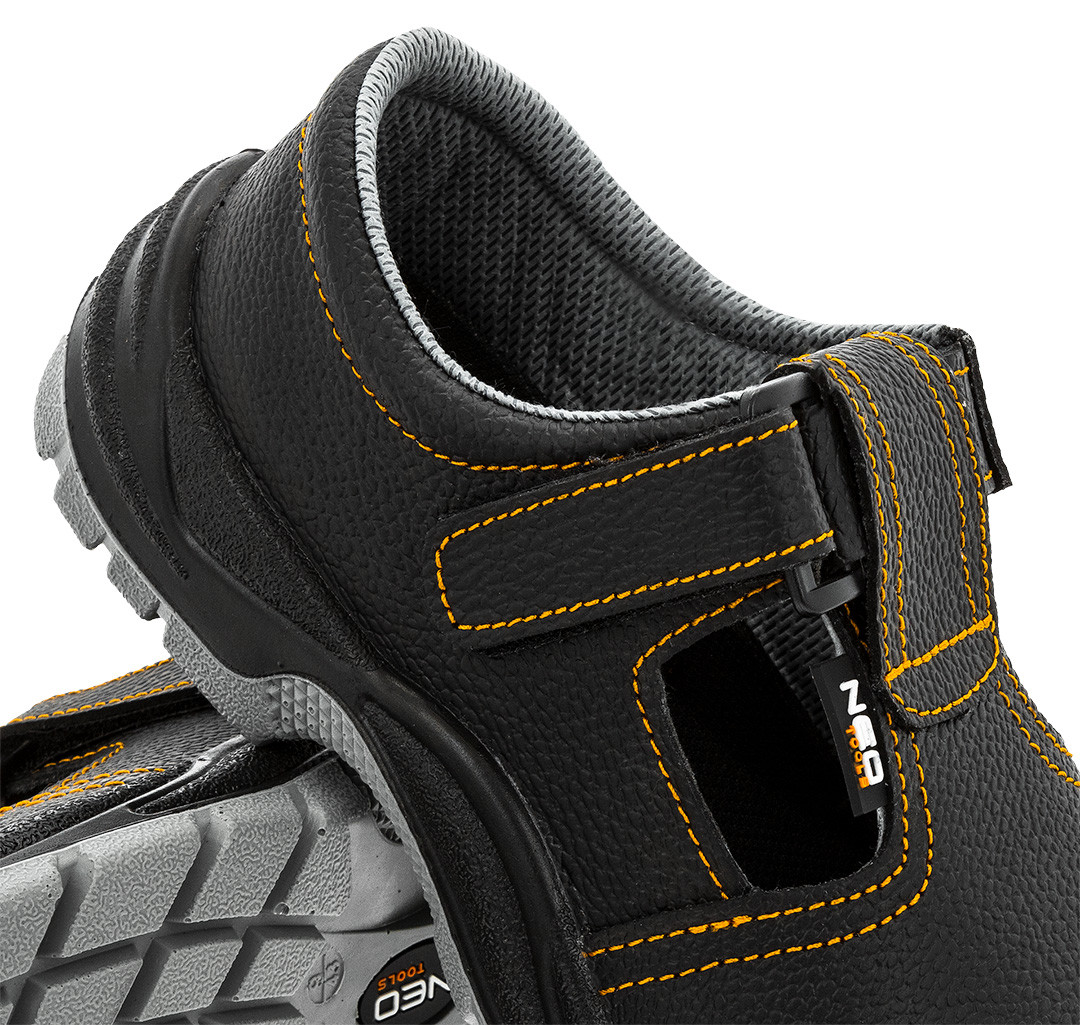 NEO 82-099 MUNKAVÉDELMI SZANDÁL, BŐR, S1 FO, ACÉLBETÉTES. A védelmi kategória azt is garantálja, hogy a cipő talpa ellenáll a szénhidrogéneknek, például olajnak vagy benzinnek. A NEO TOOLS munkaszandál bőr felsőrésszel, textilbéléssel, EVA habszivacs talppal és PU/PU talppal rendelkezik. Antisztatikus tulajdonságokat és csillapítást biztosít a sarokrészen. A szellőzőnyílások megfelelő szellőzést biztosítanak a meleg nyári hónapokban. A NEO TOOLS márkájú lábbeli az EN ISO 20345 szabványnak megfelelően készült, és tökéletes a mindennapi használatra a szakemberek számára.