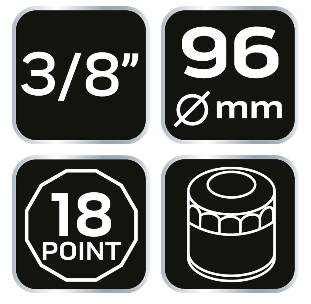 Olajszűrő kulcs, 96 mm-es, 18 pontos, 11-373, NEO - professzionális olajszűrő-leszedő kulcs. A 96 mm átmérőjű, 18-szögű olajszűrőkhöz passzol. 3,8"-os négyszögkulcs nyílás (10 mm). Különféle márkájú autókhoz használható. A kulcs feketére festett lemezből készült.