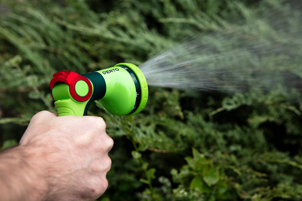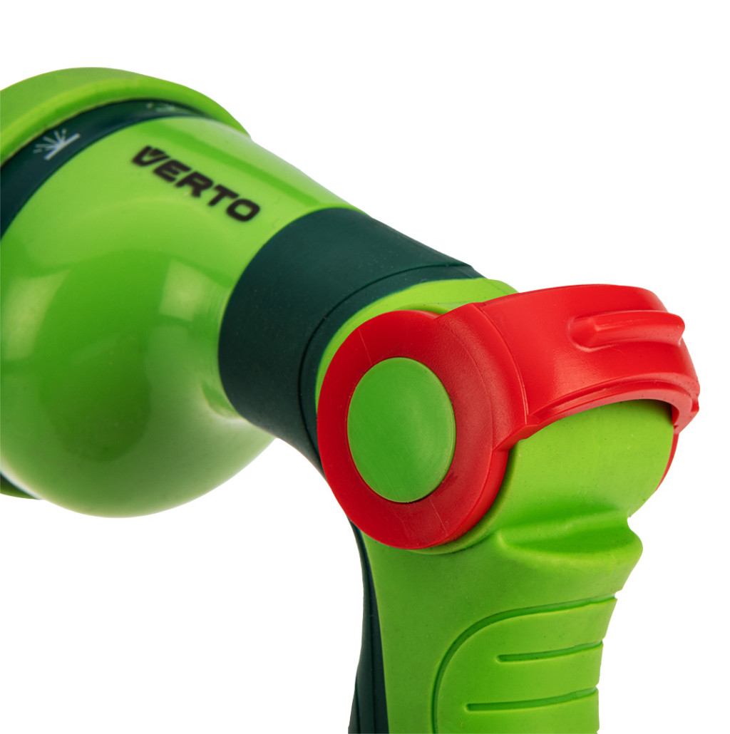 VERTO 15G717 öntözőpisztoly, 10 funkciós, hüvelykujj szabályzós. A pisztoly víznyomása fokozatmentesen állítható . Az egyértelmű jelölések megkönnyítik a megfelelő szóráskép kiválasztását. Az ergonomikusan kialakított fogantyú jól ül a kézben és nem csúszik, így kényelmesebbé teszi a munkát. A szórófej ABS műanyagból készült, részben TPR gumival borítva.