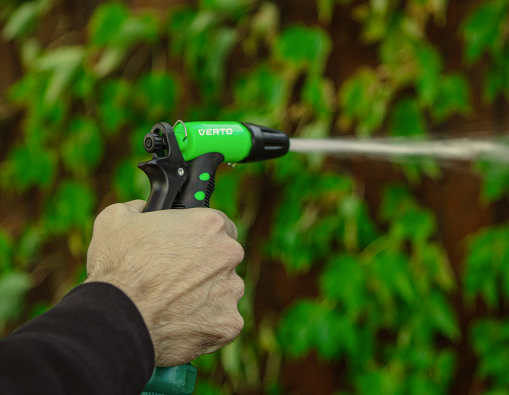 A VERTO 15G718 állítható, 2-funkciós pisztolyos locsoló egy gombbal rendelkezik, amellyel a vízsugár alakja a ködtől az erőteljes pontszerű permetezésig beállítható. A pisztoly zárható hátsó karral rendelkezik, így folyamatos üzemmódban is működhet. Az ergonomikusan kialakított fogantyú jól illeszkedik a kézbe és nem csúszik, növelve a kényelmet. A termék tartós, részben TPR gumival borított ABS műanyagból készült.