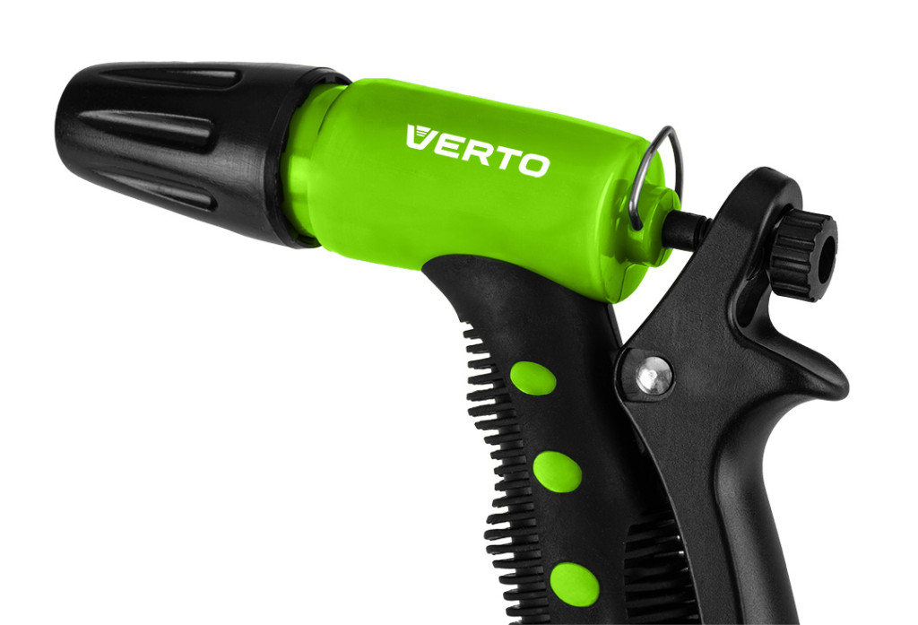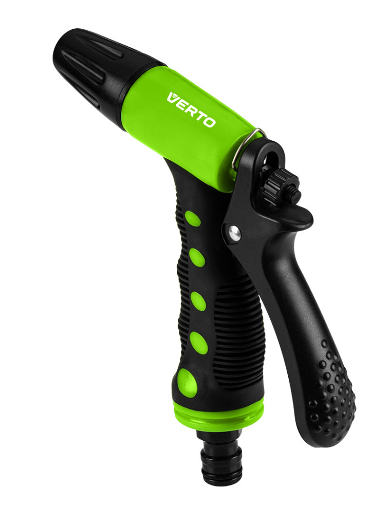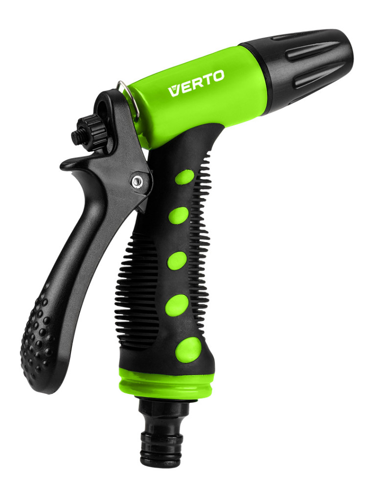 VERTO 15G718 öntözőpisztoly, 2 funkciós. A pisztoly egy gombbal rendelkezik, amellyel a vízsugár alakja a ködtől az erőteljes pontszerű permetezésig beállítható. A pisztoly hátsó reteszelő karral rendelkezik, így folyamatos üzemmódban is működhet. Az ergonomikusan kialakított fogantyú jól illeszkedik a kézbe és nem csúszik, növelve a kényelmet. A termék tartós, részben TPR gumival borított ABS műanyagból készült.